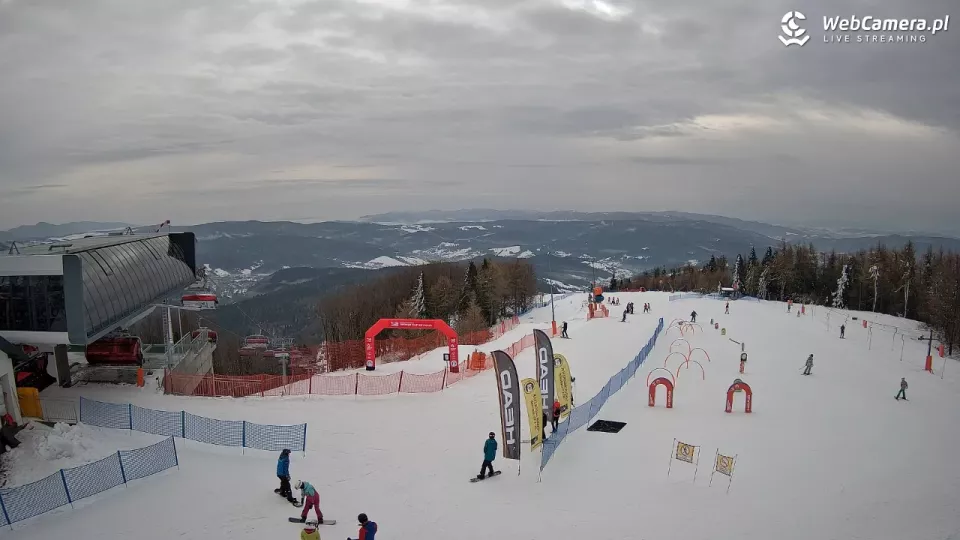 Jaworzyna Krynicka - widok na nową kolej oraz narciarzy i snowboardzistów